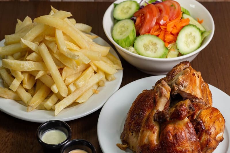 Otra opción es el Combo 3 ($ 13.000), de medio pollo, con ensalada, papas fritas y sus salsas; o si prefieres el Mostrito ($ 9.000), que es un cuarto de pollo, más papas fritas, además de una porción de arroz chaufa, ensalada y sus salsas.
