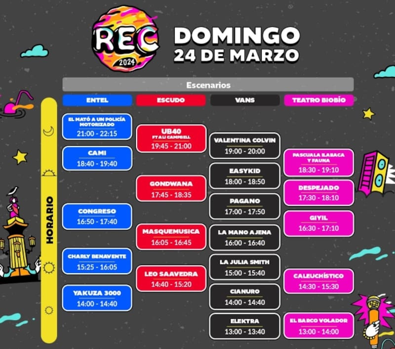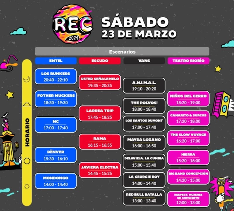 Si te quieres organizar con los artistas que quieres ver, puedes revisar en la siguientes gráficas los horarios por cada día de REC 2024.