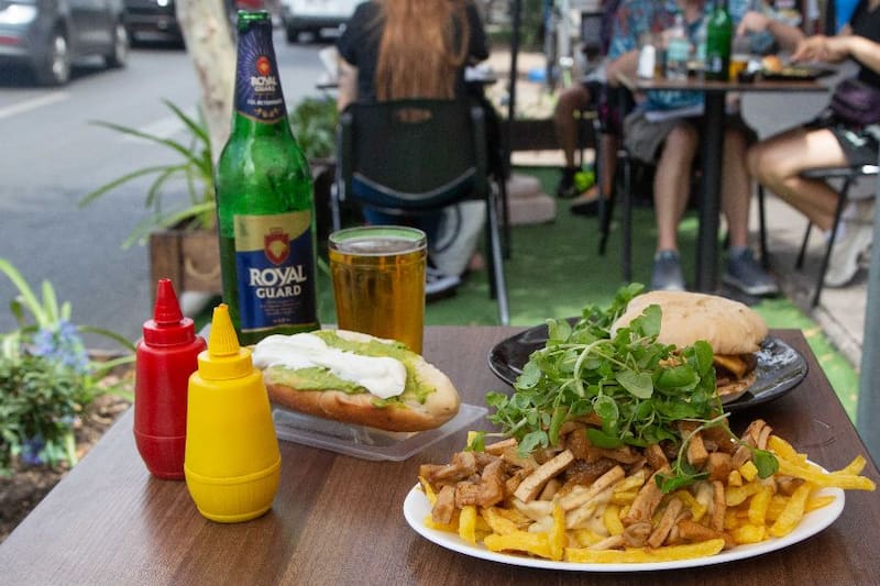 Eso, porque ahí encuentras la clásica carta de una fuente de soda, con cervezas de a litro,completos, chorrillanas y sándwiches, pero todo hecho en base a plantas. Es decir, una carta 100% vegana.