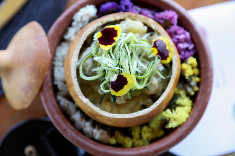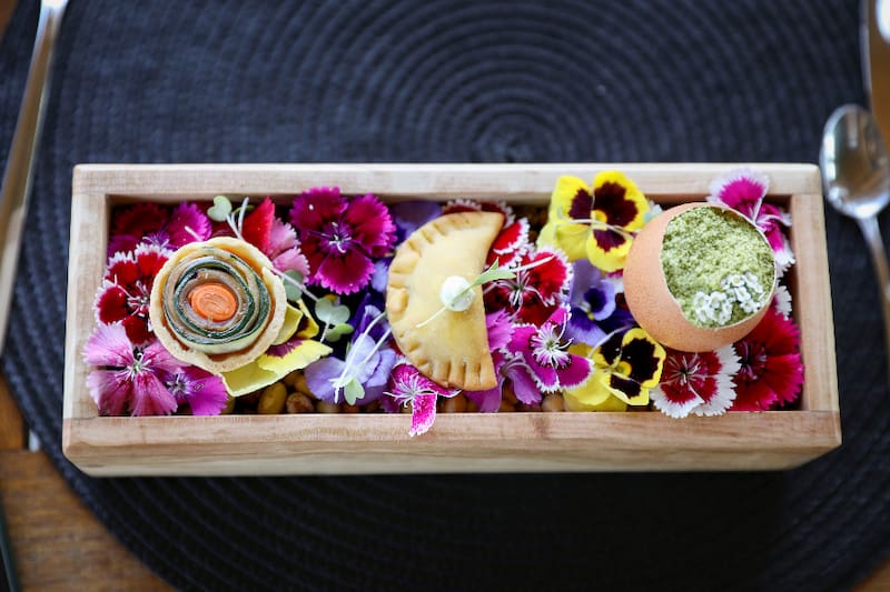 En primer lugar, la cocina está inspirada en los sabores de Chile, con foco en los productos de la zona, y el uso de la técnica. En el caso del menú ícono por ejemplo, te encontrarás con seis tiempos, platos como la berenjena, en salsa agridulce, con mostaza encurtida, flores y brotes de la huerta.