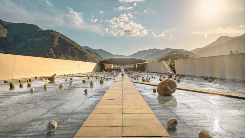 Primero, es un lugar que te dejará sin aliento por su construcción ultra vanguardista, a cargo del arquitecto uruguayo Marcelo Daglio, en el que destaca un techo ondulado de titanio, que se asemeja al paisaje y brilla como el oro, en mapudungún, Millahue, viene de milla que es oro.