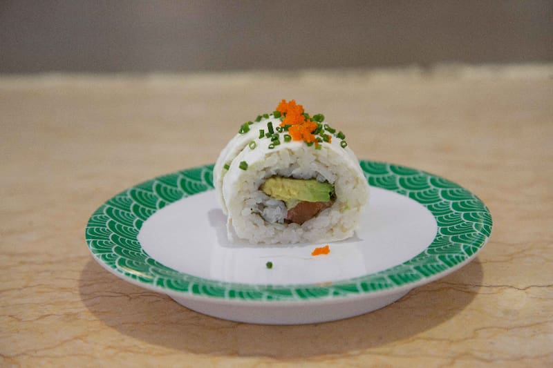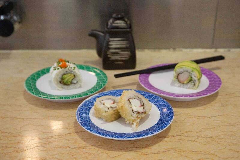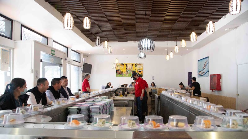 ¿La razón? Es que si bien puedes comer a la carta si te instalas en el salón o la terraza, la principal atracción es sentarse en la barra, ubicada al centro del restaurante, una giratoria donde van rotando distintos tipos de rolls.