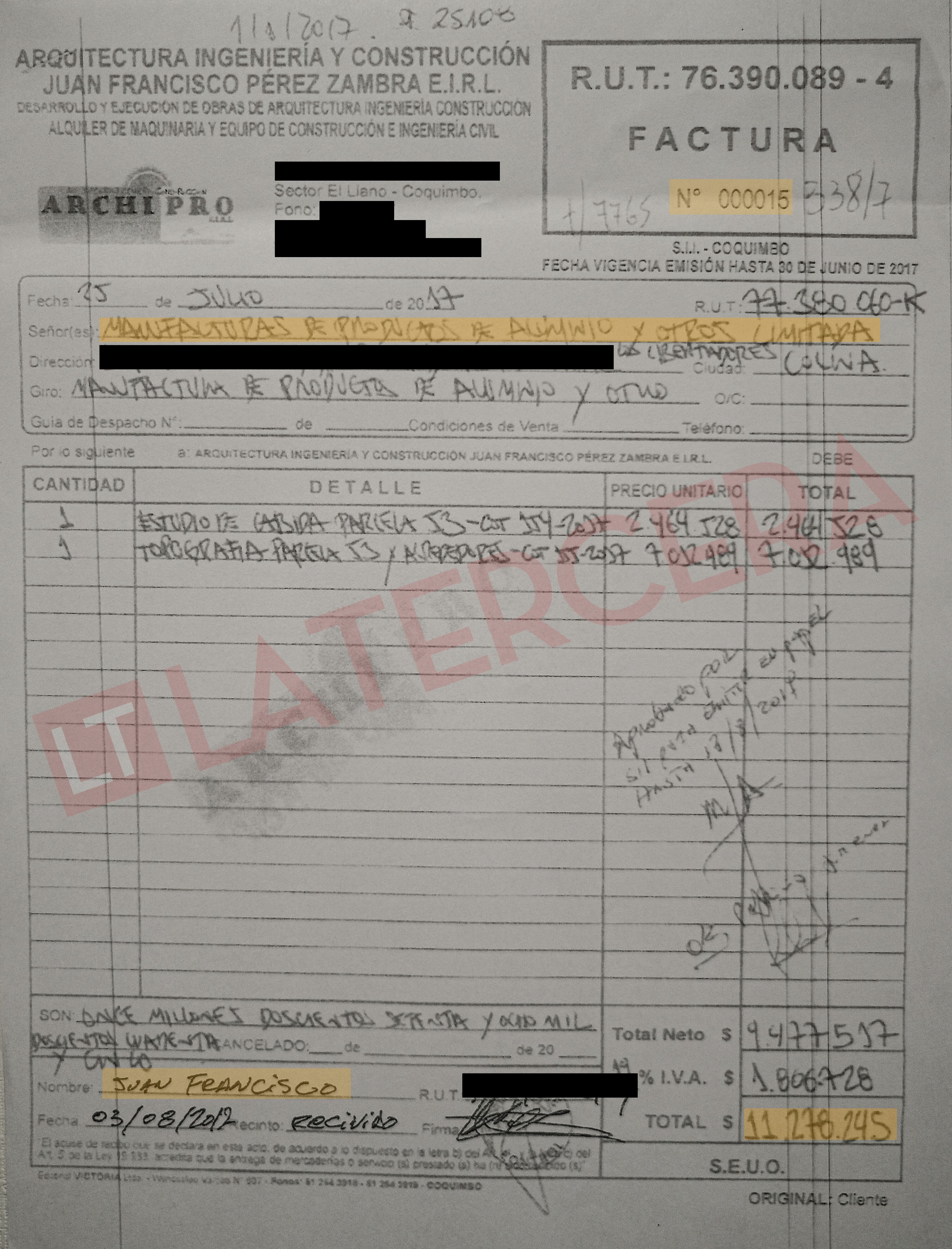 La Unidad de Investigación y Datos obtuvo una copia de esa factura, de fecha 25 de julio de 2017. Fue emitida a nombre de Manufacturas de Productos de Aluminios y Otros (MPAL). En el detalle, se indica que corresponde al pago de un “estudio de cabida” y de un estudio topográfico.
