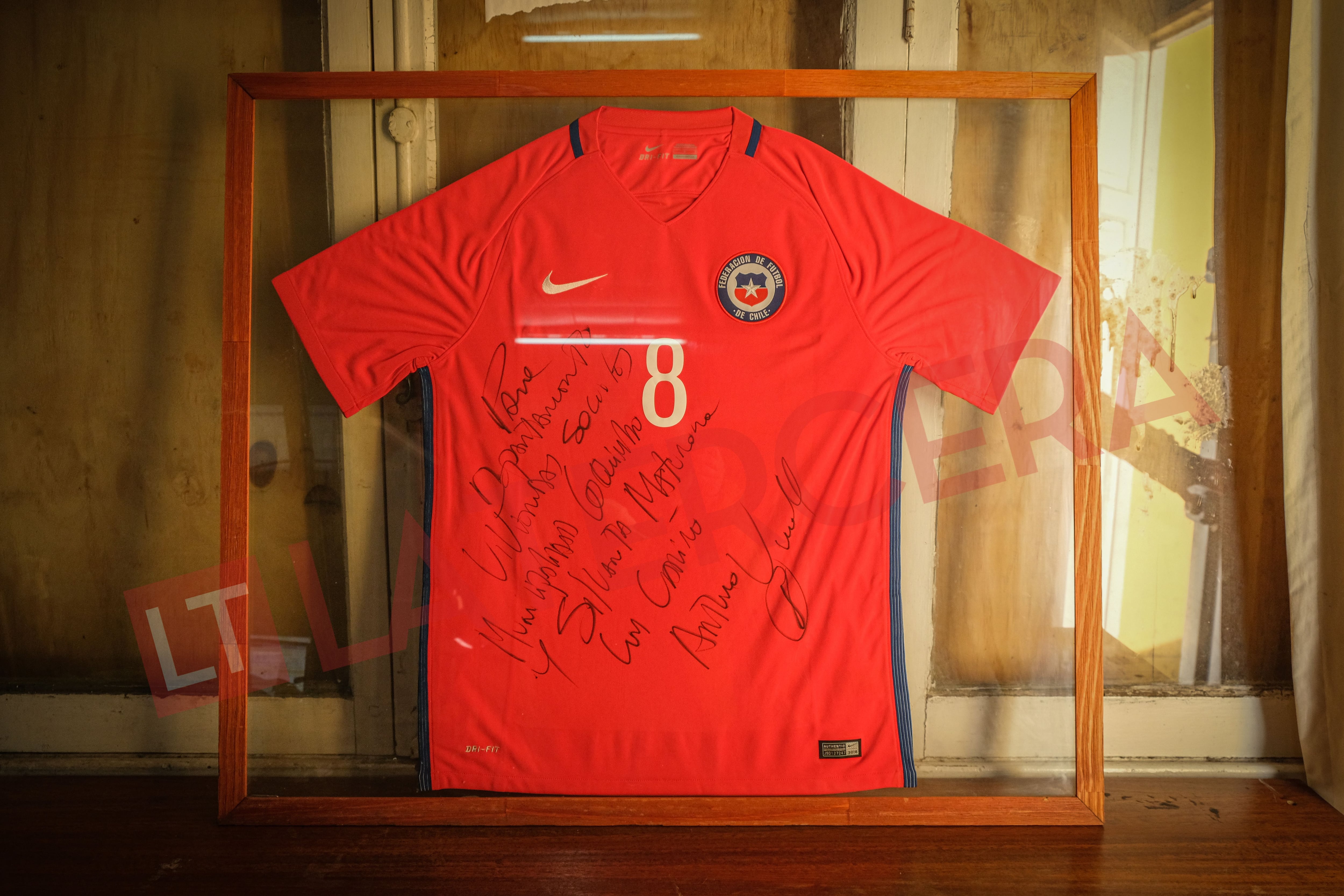 La camiseta roja con el dorsal número 8 está enmarcada en madera y vidrio. Por su peso, debe ser trasladada entre dos personas. El diseño es de la época en que la “Roja” había logrado el segundo lugar en la Copa Confederaciones y aún mantenía opciones de ir al Mundial de Rusia 2018. Es decir, mediados de 2017.