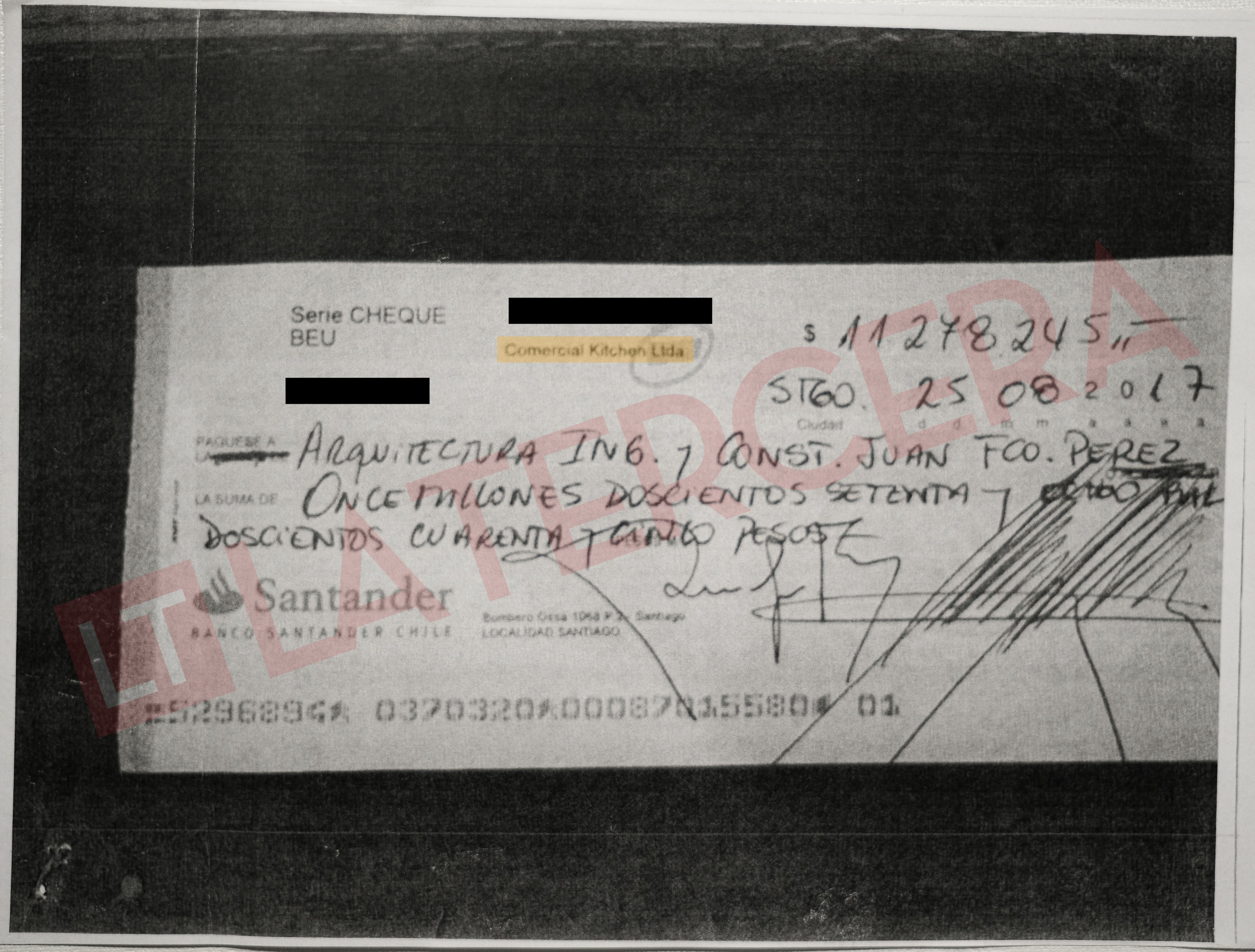 La Tercera también accedió una copia del cheque en cuestión de fecha 25 de agosto de 2017. Según la imagen, los $11.278.245, que fueron cobrados íntegramente, provenían también de MPAL (ex Comercial Kitchen Limitada). Es decir, la misma empresa en la que Manuel José Amenábar era Gerente de Administración y Finanzas.