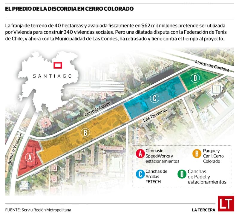 Un terreno fiscal de cuatro hectáreas, situado en el codiciado sector del Parque Araucano, ha concitado una cruda disputa entre Vivienda y la Municipalidad de Las Condes. En medio, la Federación de Tenis de Chile se resiste a abandonar el lugar, que desde junio pasado ocupa sin ningún tipo de permiso ni pago al Estado.