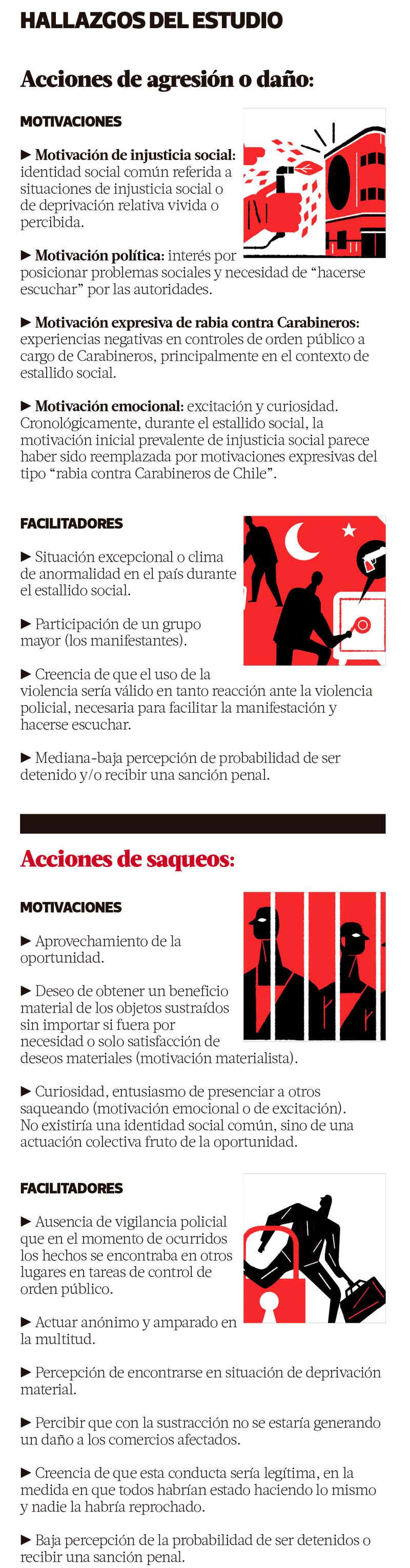 En el caso de los imputados por conductas de agresión o daños, el estudio dice que los entrevistados declararon motivaciones de injusticia social, política, rabia contra Carabineros y factores emocionales, facilitados por la idea de que la violencia sería válida para hacerse escuchar ante la eventual agresión policial.