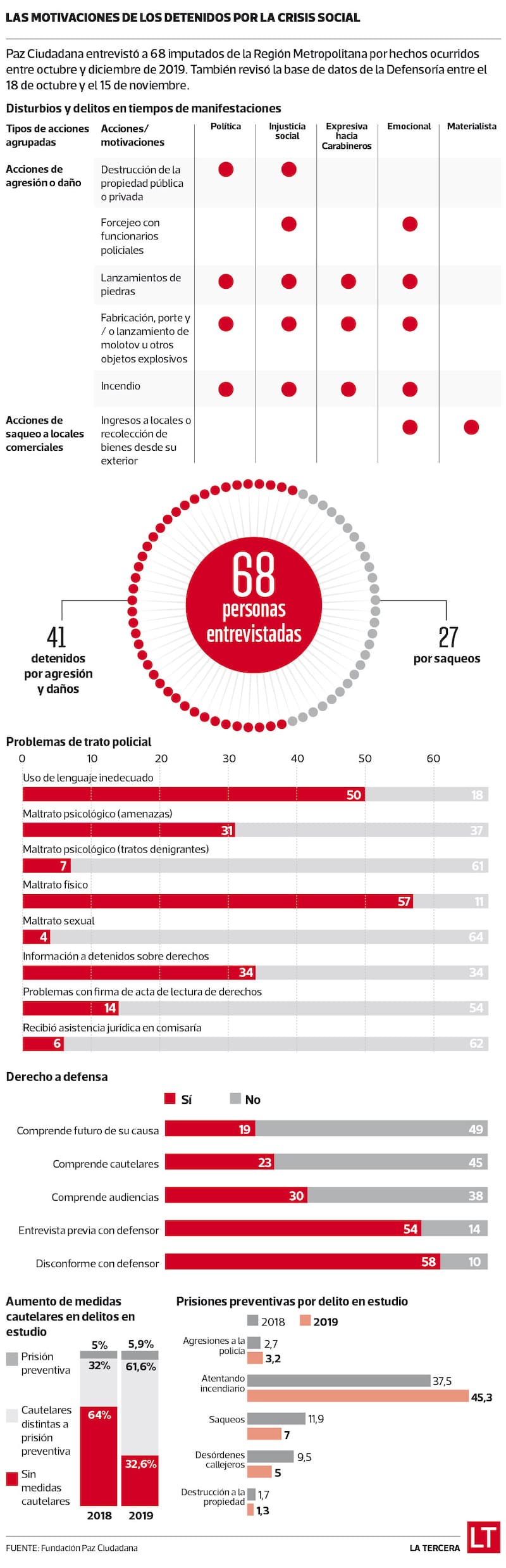 Para el análisis se entrevistó a 68 detenidos en la Región Metropolitana entre octubre y diciembre de 2019 (ver infografía). De ellos, 41 fueron arrestados por desórdenes públicos, daños a monumentos nacionales, atentados contra la autoridad, maltrato de obra a carabineros, atentado explosivo, entre otros delitos similares. Y 21 fueron detenidos por saqueos a locales comerciales.