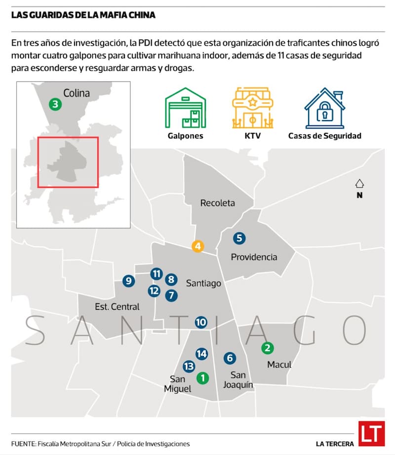 Especialistas en cultivar y procesar marihuana indoor en diferentes comunas de Santiago, esta organización asiática logró montar cuatro galpones en los que plantó más de siete mil plantas, levantando también una red de 11 casas de seguridad para esconder armas, drogas sintéticas y dinero en efectivo. Esta es la historia de sus movimientos en el país que terminó con 21 ciudadanos chinos tras las rejas, cuyo último episodio ocurrió hace dos semanas con la detención de los financistas, entre ellos, el presidente de la cámara china de comercio en Temuco.