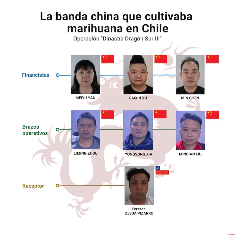 Escuchas telefónicas, levantamiento de secreto bancario y declaración de otros imputados comprobaron la participación de Caixin Yu como uno de los financistas de la agrupación, que fue desarticulada a fines de abril tras tres años de operativos. La policía además detuvo a 21 ciudadanos chinos, quienes arrendaban galpones en distintas comunas de Santiago para cultivar y cosechar marihuana indoor, con un método nunca antes visto en Chile, menos a esa escala. Producto de 26 operativos, la PDI decomisó más de 7 mil plantas, 470 kilos de cannabis procesada, drogas sintéticas, 11 armas, 400 municiones y 500 millones en efectivo desde el año 2020 a la fecha.