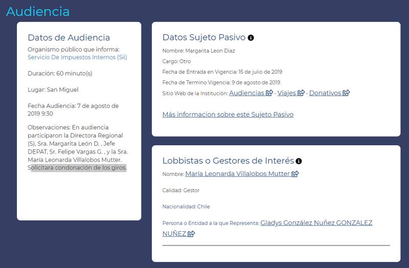 Y un año más tarde, en 2017, creó la empresa “Steuern Asesorías SpA”, sociedad que es mencionada en el audio de la reunión con Hermosilla y Sauer, a la que se habrían emitido millones en documentos ideológicamente falsos. Ese mismo año registró su primera audiencia por Ley de Lobby, en la que representó a la empresa “Pesquera Villa Alegre” ante el SII de La Serena para el “levantamiento de exclusión y trabajo para pagar deudas generadas por tributos”.