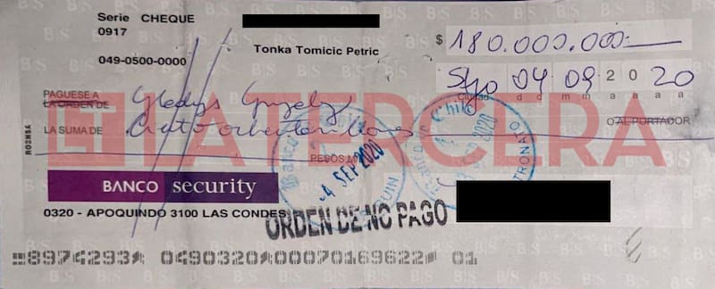 Por ello, la “Cuca” “entregó la suma de $180 millones a la demandada, tomando en cuenta que eran conocidas y en virtud del carácter público de esta no desconfió”. De vuelta, el 4 de septiembre de 2020, Tomicic le entregó a Gladys González el millonario cheque. Pero una “firma disconforme” le impidió el cobro del documento, por lo que tuvo que recurrir a tribunales.
