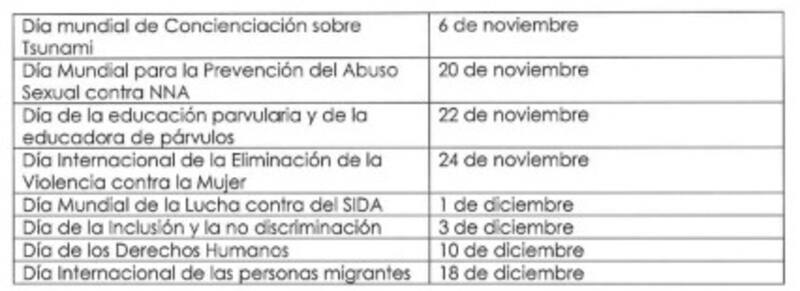 De igual forma, se asegura que “cada comunidad educativa definirá cuáles de estas fechas relevarán en los distintos niveles educativos y de qué modo. Para algunas de ellas se elaborarán orientaciones que se pondrán a disposición de las comunidades educativas”.