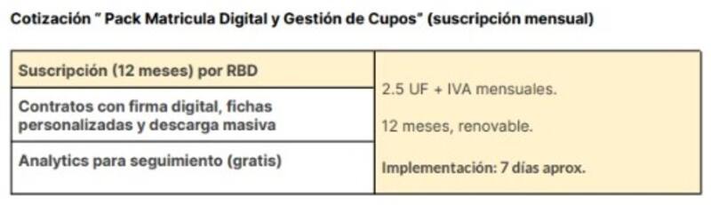 ¿Y qué decía esa cotización? En ella se aprecia que por 2,5 UF mensuales (cerca de $92.800) se podía contratar el ‘Pack Matrícula Digital y Gestión de Cupos’, que incluía contratos con firma digital, fichas personalizadas, descargas masivas y, gratuitamente, un servicio analítico de seguimiento.