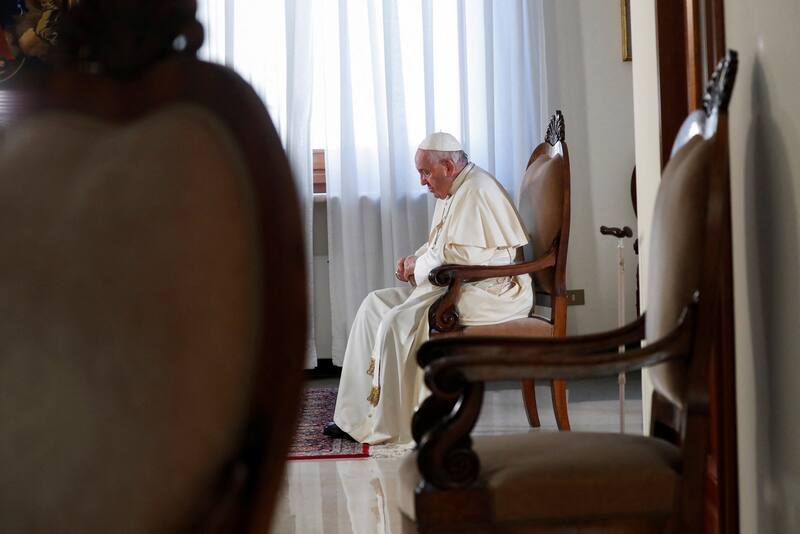 Francisco usó un bastón cuando entró a una sala de recepción en la planta baja de la casa de huéspedes de Santa Marta, donde ha vivido desde su elección en 2013, evitando el departamento papal en el Palacio Apostólico utilizado por sus predecesores.