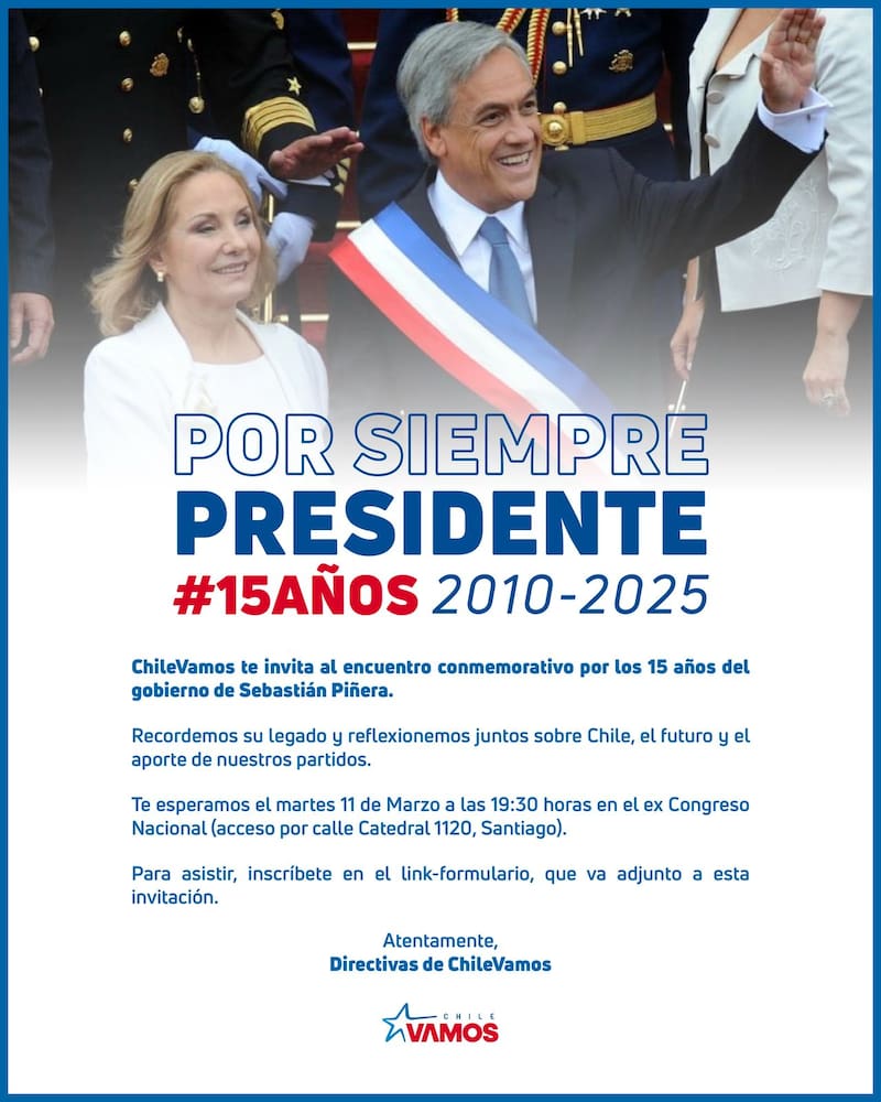 Es ese hito, el próximo 11 de marzo los partidos de Chile Vamos conmemorarán en la sede de Santiago del Congreso Nacional. “Chile Vamos te invita al encuentro conmemorativo por los 15 años del gobierno de Sebastián Piñera. Recordemos su legado y reflexionemos juntos sobre Chile, el futuro y el aporte de nuestros partidos”, dice la invitación que fue difundida este lunes a excolaboradores y autoridades del bloque.