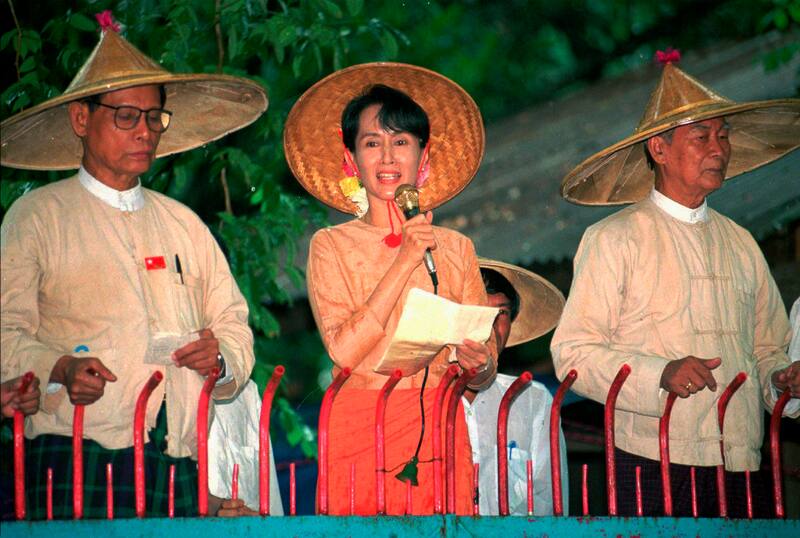 La líder Aung San Suu Kyi ofrece un discurso a sus partidarios fuera de su casa en Rangún, Myanmar, en junio de 1996. Foto: AP Stuart Isett