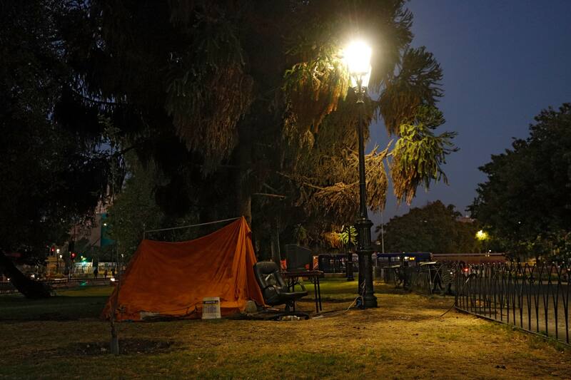 A pocas cuadras de calle Cienfuegos, en la Alameda con Brasil, el bandejón central está tomado por 10 carpas. Aquí, R.C.H. (33), otro venezolano proveniente de Caracas, cuenta que se reúnen entre 20 a 30 personas, sobre todo en las noches. “Son varias familias, todas de Venezuela”, explica. Se ayudan a cocinar, a conseguir dinero, a lavar la ropa y a cuidarse.