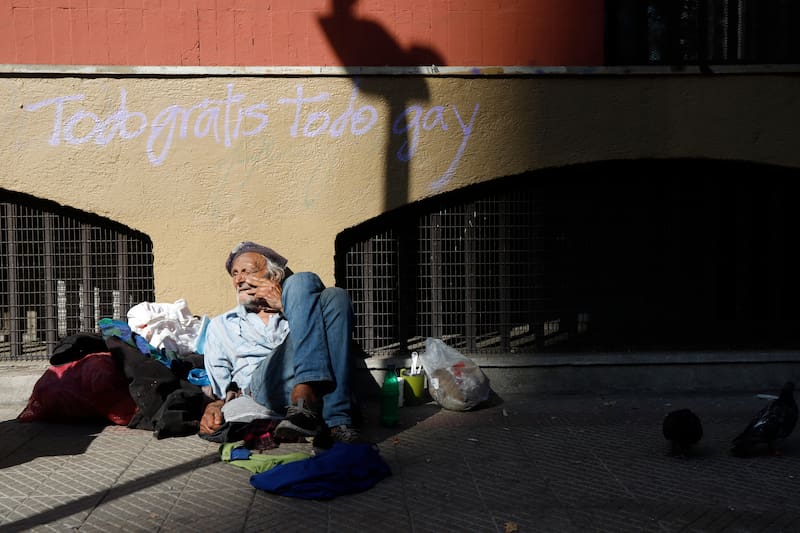 Sobre una pequeña frazada, en la Plaza de los Libros, justo en la intersección de las calles Marcoleta, Lira y Diagonal Paraguay, a metros del Hospital de la UC, Manuel Serna Gómez (89) aparece como el único ocupante del lugar. Lleva poco más de un año viviendo en la calle, arrastrado por la imposibilidad de pagar un arriendo y comer, pues su pensión, asegura, es de $ 188.000.