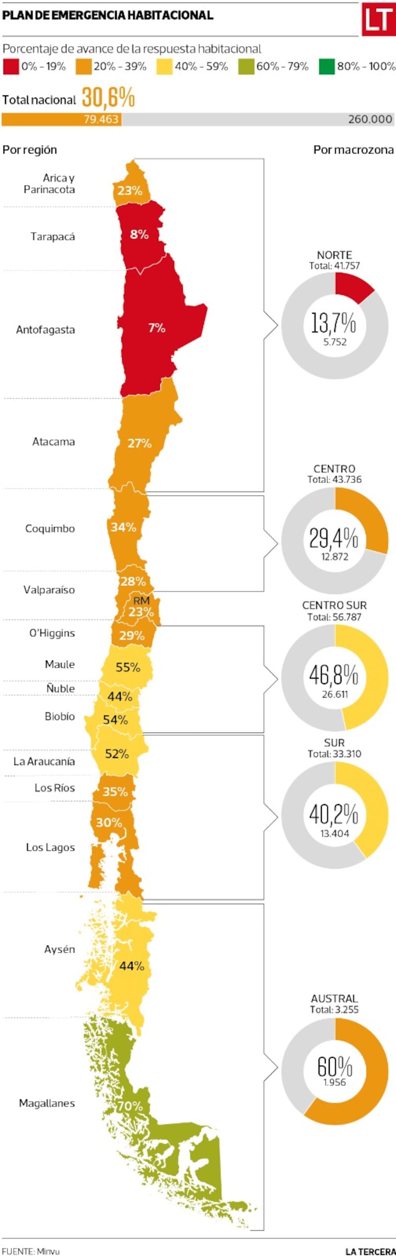 El Plan de Emergencia Habitacional exhibe un estado de avance con realidades disímiles. El Ministerio de Vivienda y Urbanismo calcula un 30,6% de progreso a nivel nacional, que corresponde a 79.463 viviendas de un total de 260.000 fijadas como meta para los cuatro años de gobierno. Una cifra que contrasta con el 13,7% que refleja la denominada Macrozona Norte, que exhibe un total de 5.752 viviendas terminadas en las regiones de Arica, Tarapacá, Antofagasta y Atacama, que en conjunto tiene una meta de 41.757 casas.