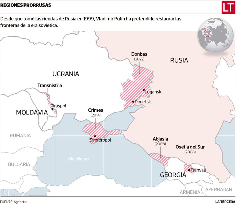 Pero hay más. Tal como ocurre ahora con las acciones militares de Rusia en Ucrania, en 2008 Putin ocupó este mismo “manual” cuando Georgia -otra exrepública soviética- intentó tomar el control de las regiones prorrusas de Osetia del Sur y Abjasia, que se declararon independientes en 1992 y 1994, respectivamente. Después de que el Ejército georgiano irrumpió en Osetia, el mandatario ruso tuvo la excusa perfecta: con el pretexto de supuestas atrocidades de Georgia contra civiles, ordenó “una operación de imposición de la paz”. En unos pocos días, Moscú y fuerzas separatistas prorrusas derrotaron al Ejército de Georgia y desde entonces ambas regiones figuran en la órbita del Kremlin.