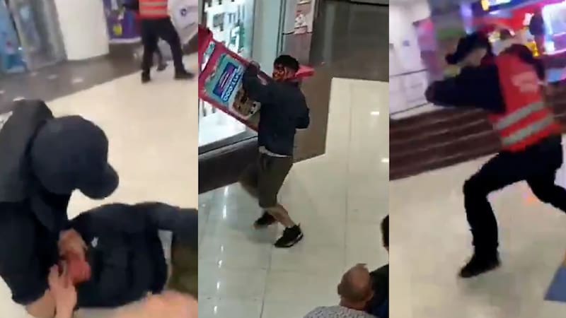 Los registros fueron difundidos en redes sociales por usuarios que se encontraban en el Mall Paseo Costanera, cuando un presunto mechero se enfrentó a varios guardias del recinto comercial.