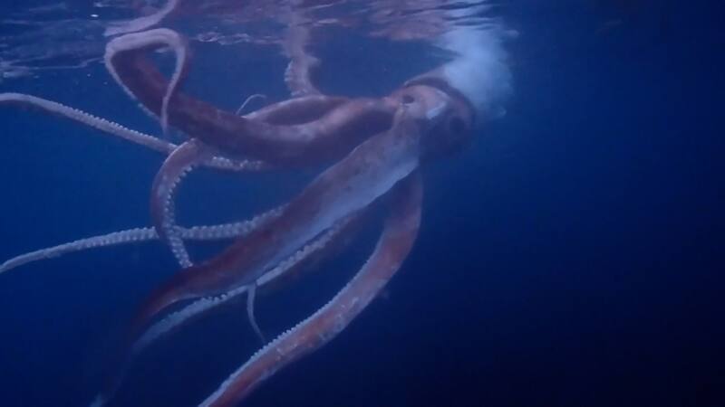 Buceadores japoneses se encontraron con un calamar colosal que media cerca de 2,5 metros, se sabe que estos ejemplares viven en aguas cercanas al país, pero no es muy usual registrarlos.