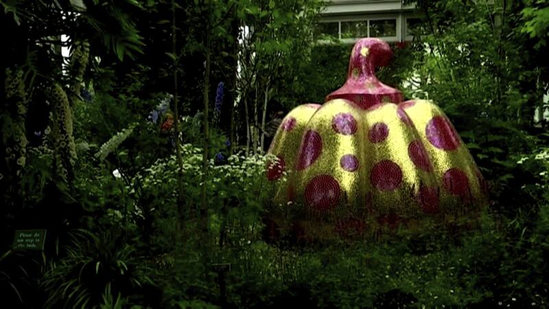 Flores y calabazas gigantes son parte de la muestra de la artista japonesa que ha deslumbrado al mundo con sus puntos y visión de la naturaleza. La exposición incluye además uno de los cuadernos de bocetos originales de Kusama, que ilustra el ciclo de vida de una peonía.