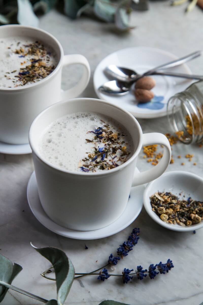 • 2 tazas de agua • 1 taza y media de leche vegetal de arroz, avena o almendras • 1 cdta. de manzanilla • 1 cdta. de melisa • 1/2 cdta. de anís en polvo • 1/2 cdta. de nuez moscada • 1/2 cdta. de canela en polvo • 2 dientes de cardamomo molidos • Panela a gusto