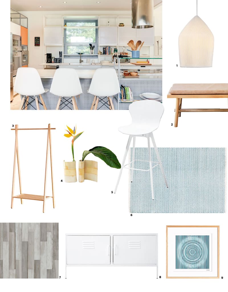 1. Lámpara de suspensión Reykjavik 18, colección Design For The People, diseño de Sebastian Holmbäck para de Nordlux, consultar precio (@opendark.cl) 2. Banca T, madera lenga, $430.000; cojín cuero, $260.000 (@brocachile) 3. Recibidor madera pino, $120.000 (@bp.diseno) 4. Par de floreros, cerámica gres, $45.000 (@la_maja_project) 5. Taburete Adelaide, $299.000 (boconcept.cl) 6. Alfombras algodón, desde $50.000 (faisan.cl) 7. Porcelanato alma argento, Campani, Italia, look madera, consultar precio (Atika.cl) 8. Rack TV pop, blanco mate, $148.740 (@rockers_industrial) 9. Grabado Giclée: Las obras de la diseñadora industrial y artista autodidacta Cata Cáceres destacan por su dinamismo permanente, factura perfecta y delicadeza en la superposición de elementos. Obra “Agua”, 87 x 87 cm, con marco, consultar precio (catacaceres.cl).