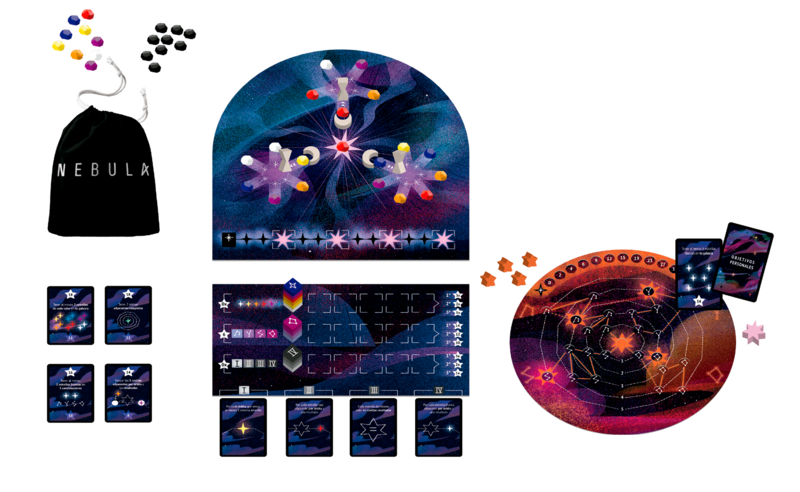 ¿Pero de qué se trata? Nebula es un juego abstracto con temática espacial, en donde los jugadores tendrán que ir tomando turnos para adquirir y posicionar diferentes tipos de estrellas para formar patrones, ganar puntos y realizar misiones secretas. Es, por naturaleza, un “multijugador solitario”, es decir, cada jugador se preocupará de su tablero, teniendo como interacción principal el tablero común en donde estarán las estrellas que podrán adquirirse a través de dos mecanismos distintos.