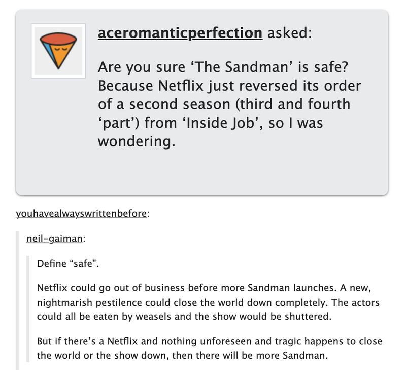 A través de Tumblr un usuario le preguntó a Gaiman si podría suceder lo mismo que pasó con Inside Job con The Sandman. “¿Estás seguro de que ‘The Sandman’ está a salvo? Porque Netflix acaba de revertir la orden para una segunda temporada (tercera y cuarta ‘parte’) de ‘Inside Job’, así que me preguntaba”, señaló el usuario.
