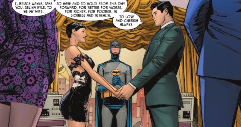 Así, repitiendo uno de los arcos más aclamados de su carrera en el título principal del hombre murciélago, King incluyó a Clark Kent/Superman y Lois Lane en esta historia para que sean los testigos del matrimonio de Bruce y Selina en la notable ceremonia ante el juez vestido como el Batman de Adam West.