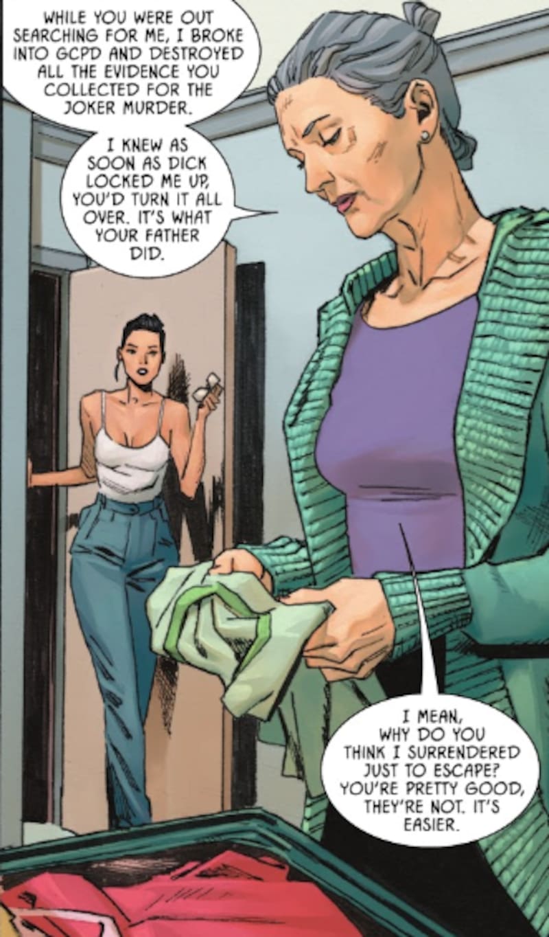 Por supuesto, Selina tenía todo planeado para su libertad y, pese a los reclamos de su hija, terminó por huir de Gotham para evitar definitivamente cualquier persecución por al asesinato del Joker.