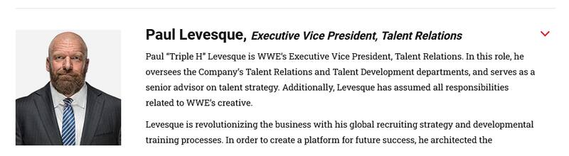 La información ya está oficializada en el sitio de la WWE, en donde se estipula que “Paul ‘Triple H’ Levesque es el Vicepresidente Ejecutivo de Relaciones con el Talento de WWE. En este cargo, supervisa los departamentos de Relaciones con el Talento y Desarrollo del Talento de la empresa, y se desempeña como asesor senior en estrategia de talento. Además, Levesque ha asumido todas las responsabilidades relacionadas con la creatividad de WWE”.