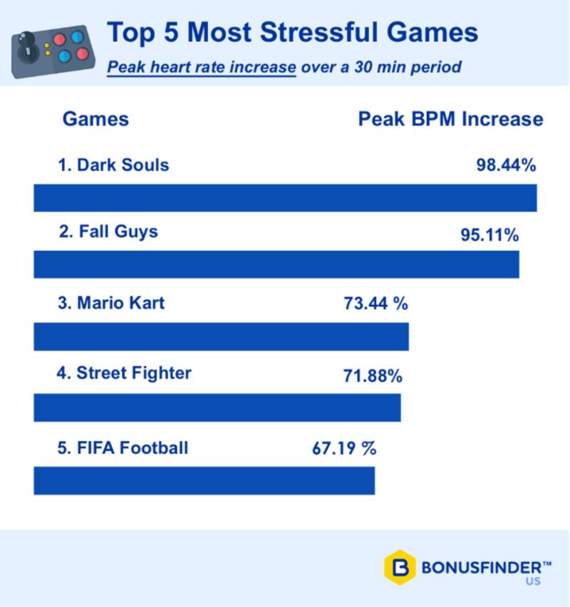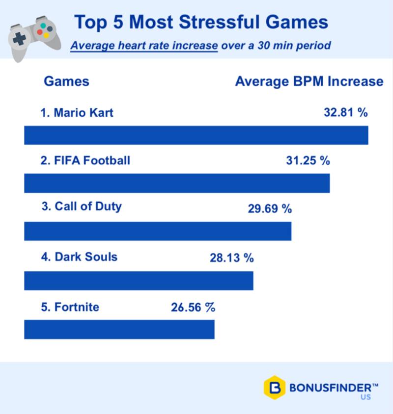 De acuerdo a BonusFinder, al considerar el aumento pomedio de la frecuencia cardíaca a lo largo de una sesión de juego de 30 minutos, el ganador estaba claro: Mario Kart sería el videojuego más estresante.