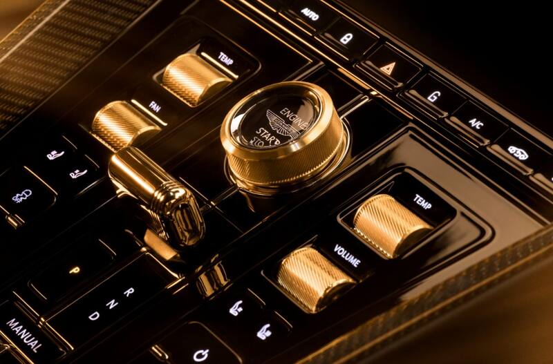 En el habitáculo, encontramos bordados tipo “príncipe de gales” en piel de color negro, inserciones en fibra de carbono con hilo dorado, mandos chapados en oro de 18 quilates, placas conmemorativas en los umbrales de las puertas y el bordado del 8 de corazones en el parasol del conductor como guiño a la última escena de Goldfinger.
