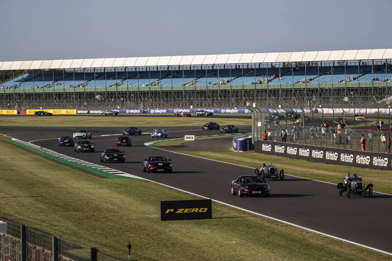 La vuelta de celebración se realizó en el emblemático circuito de Silverstone con 110 autos de la marca, reuniendo toda su trayectoria.