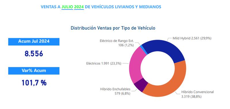 De los 8.556 vehículos nuevos de cero y bajas emisiones comercializados en Chile este año, 1.991 corresponden a modelos puramente eléctrico. Cifra que acusa un alza del 147% en la venta de este tipo de autos, si se compara con los primeros siete meses de 2023.