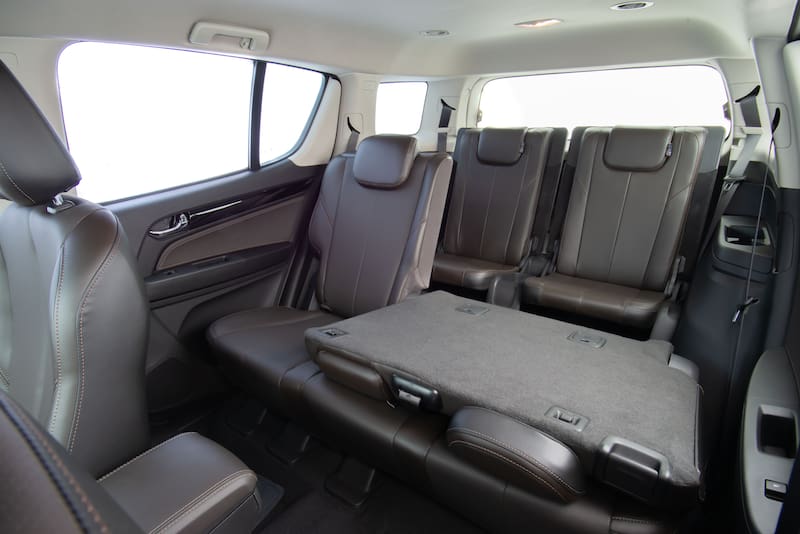 Vamos por lo primero. La posición de manejo es la que se podría esperar de un familiar basado en una camioneta laboriosa (despeje de 227 mm). Uno queda muy alto, algo que personalmente me tiende a molestar, sobre todo luego de hacer varios kilómetros sin detenciones. Mido 1.78 mts. y en carretera la verdad es que instintivamente cada cierto rato me sentía ‘echado’ sobre la butaca (es de ajuste eléctrico) para buscar esa posición más baja que acostumbro. En realidad es cosa de gustos, pero, claro, mejor sería que tuviera un pelo más de recorrido hacia abajo. Salvado eso, los asientos tapizados en cuero en las tres filas son en general de muy buena factura. Solamente la tercera corrida es de verdad estrecha y sirve para personas muy bajas o niños de poca contextura. En mi caso, la cabeza me quedó rozando el techo.