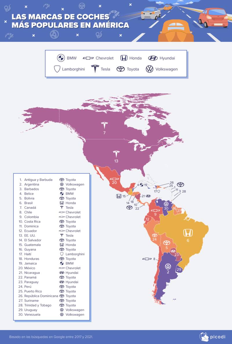 Los países más grandes de Norteamérica, Canadá y Estados Unidos, tienen a Tesla liderando las búsquedas online, sin embargo, con el mismo número de países se encuentran BMW, popular entre beliceños y jamaicanos; Honda que hace lo propio en Brasil y Guatemala, mientras Hyundai domina en Nicaragua y Paraguay.