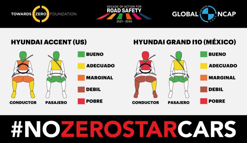 Según indica Latin NCAP, los resultados que muestran las opciones más económicas a las que pueden acceder los usuarios en sedanes de Hyundai en ambos países demuestran “el doble estándar en seguridad vehicular que se aplica en dos lados de la frontera”.