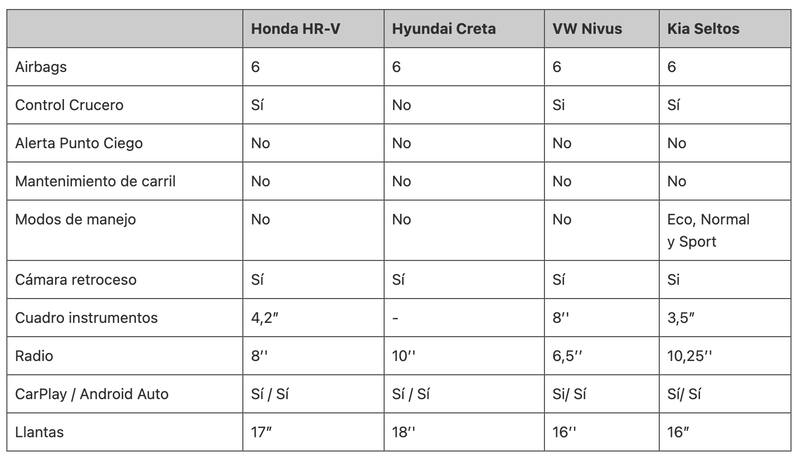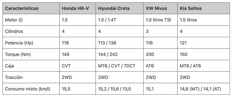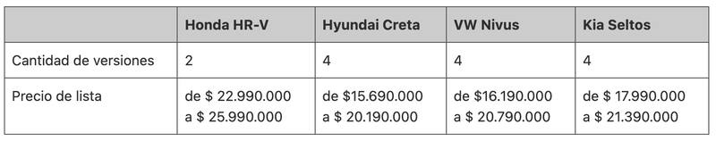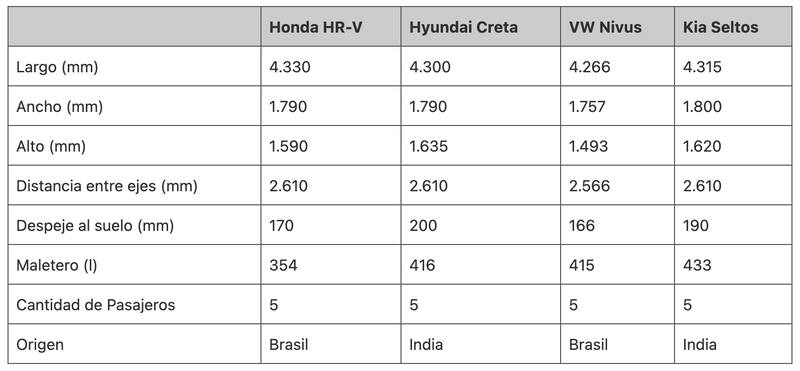 En ese contexto, los modelos que tomamos de análisis junto al Honda HR-V son el Hyundai Creta, Volkswagen Nivus y Kia Seltos.