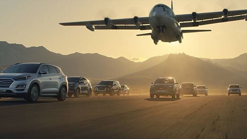 El video muestra un avión carguero C-130 en lo alto del cielo, antes aterrizar sobre la pista del aeropuerto de Inyokern en California, donde es recibido por otros vehículos SUV Hyundai.