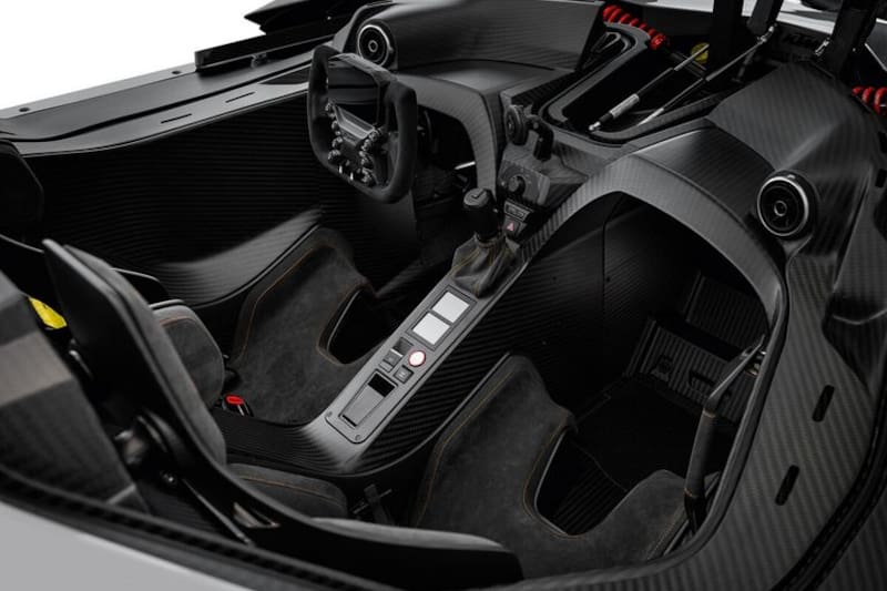 El puesto de conducción es tan radical como el de sus hermanos, incluyendo un volante extraíble de fibra de carbono con una pantalla digital, pedales ajustables, unos buenos asientos báquet con tapicería en alcántara y arneses de competición y mucha fibra de carbono rodeando el habitáculo.