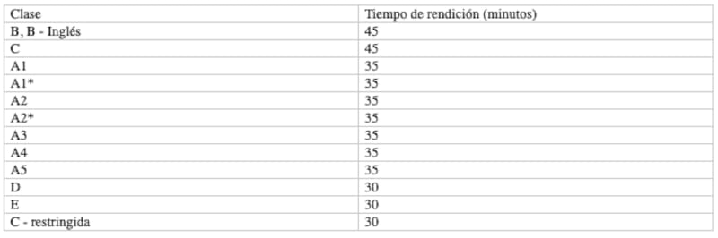 R: El tiempo total de rendición dependerá de la clase de licencia a la cual esté optando: