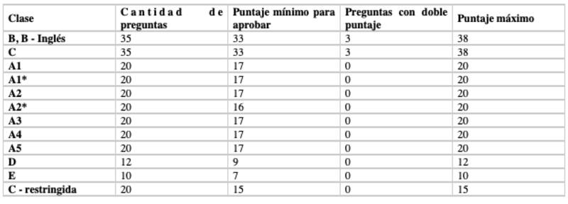 En todo caso, para aprobar el examen para las clases A1*, A2*, D y E, no podrá tenerse más de dos respuestas incorrectas en el ítem de conocimientos legales y reglamentarios.