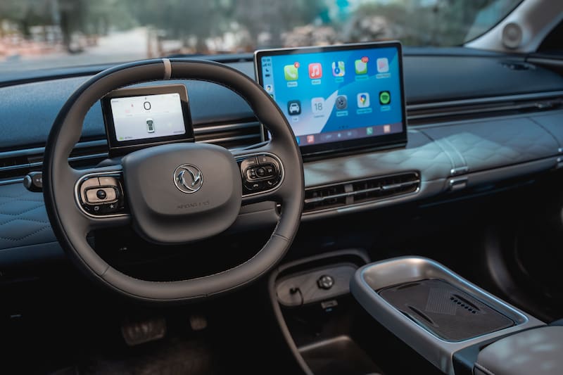 El interior del Nammi 001 es luminoso y acogedor, destacando su tapicería de ecocuero bitono, con detalles en gris, costuras en forma de rombo, y un volante bicolor ligeramente achatado.