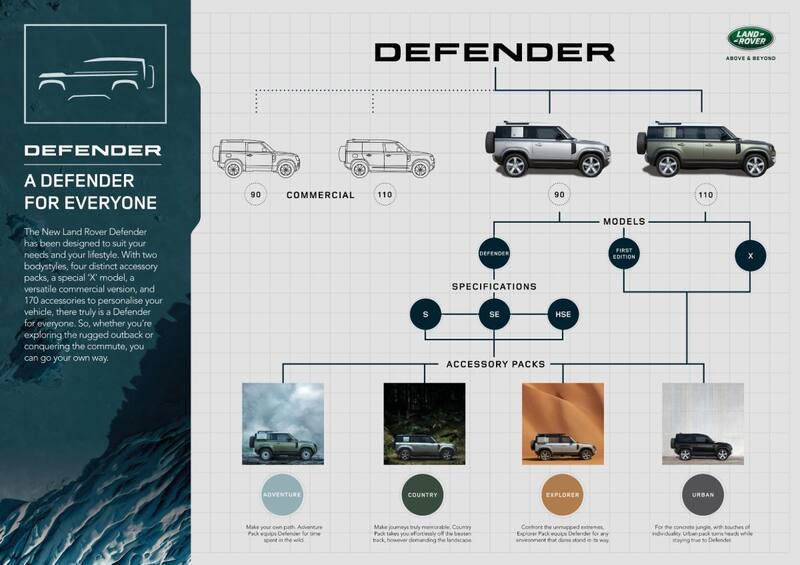 Para satisfacer a todo tipo de clientes, el Defender -que se ensamblará en Eslovaquia- se comercializará en acabados Defender, First Edition y X. La variante Defender contará con especificaciones S, SE y HSE, las que podrán contar con accesorios de look de tipo Adventure, Country, Explorer y Urban.