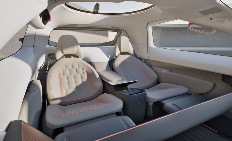 Como se trata de un vehículo autónomo, carece de volante y pedales, por lo que el habitáculo se transforma en un espacio más versátil y aprovechable, permitiendo a los pasajeros trabajar, relajarse o simplemente disfrutar del paisaje durante el trayecto.